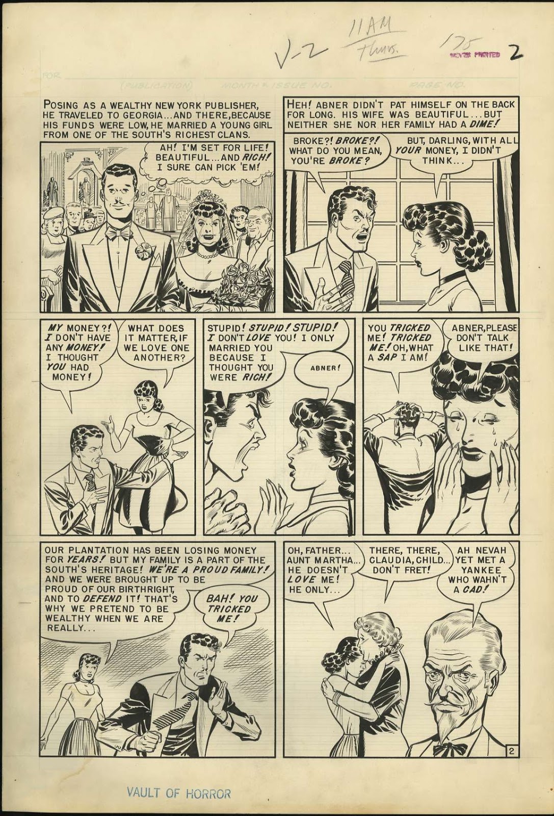 Because it was too difficult to choose a selection of art from all the EC comic stuff I have amassed over the last few months - and because I like to post original art - I have decided to go with complete stories which narrowed it down quite a bit. And since I also like to post the colored pages next to the original black and white pages there were not that many stories left. The first one I have picked for Today´s post is Southern Hospitality from THE VAULT OF HORROR 19 by EC stalwart Johnny Craig.