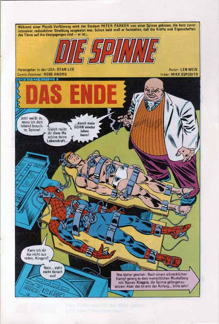 But that Spider - Man post was just splash pages so I wanted to do a black and white post for Ross Andru. Which I did in 2019, only that it turned out to be two posts rather than one. Since I already went into the publishing history of Spider - Man in Germany in this post I don´t want to bore my readers with all the details again. Let me just mention that Ross Andru was the artist of the last issues that were published by the Williams Verlag and also the first issues Condor Verlag brought to german readers when DIE SPINNE finally became a monthly title in Germany again back in 1980.